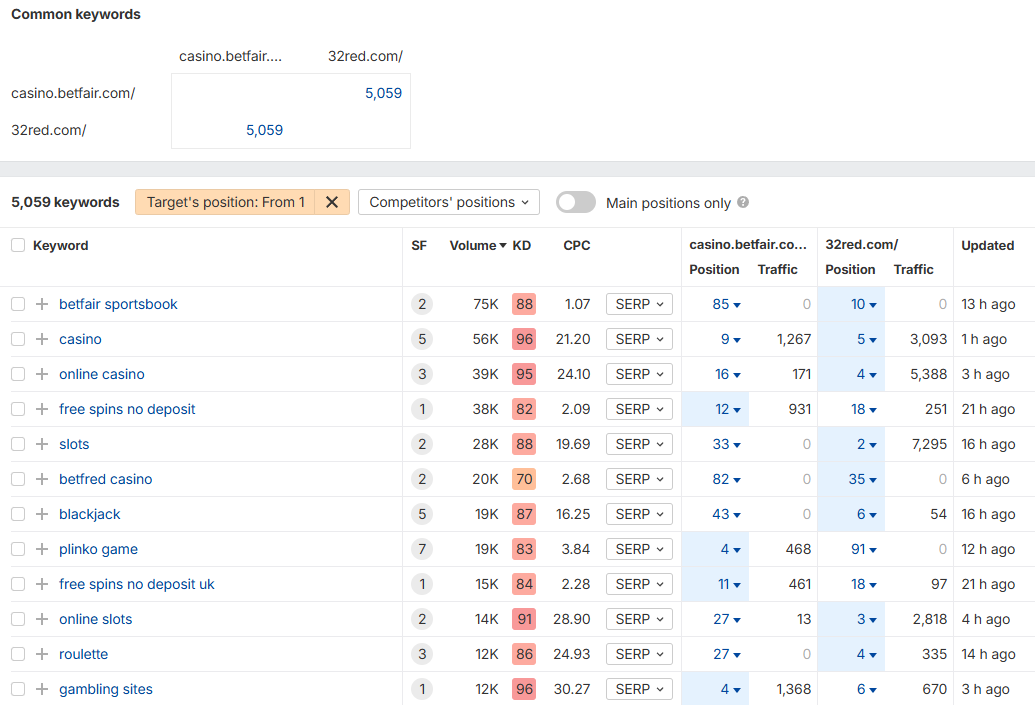 Extras din Ahrefs - Content Gap Analysis - pentru identificarea intersecției de conținut între Betfair Casino și competitorul principal din UK: 32Red