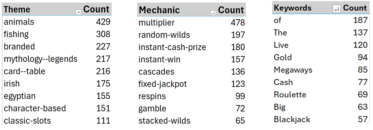 Dacă conținutul site-ului nostru este deja adăugat și clasat în baze de date, putem folosi filtrele existente pentru a identifica noi oportunități de a categoriza conținutul. În exemplul de mai jos se pot vedea câteva variante de filtrare pentru jocurile unui cazinou online (Betfair Casino) pe baza temei, a tipului de bonus și a volatilității fiecărui joc.