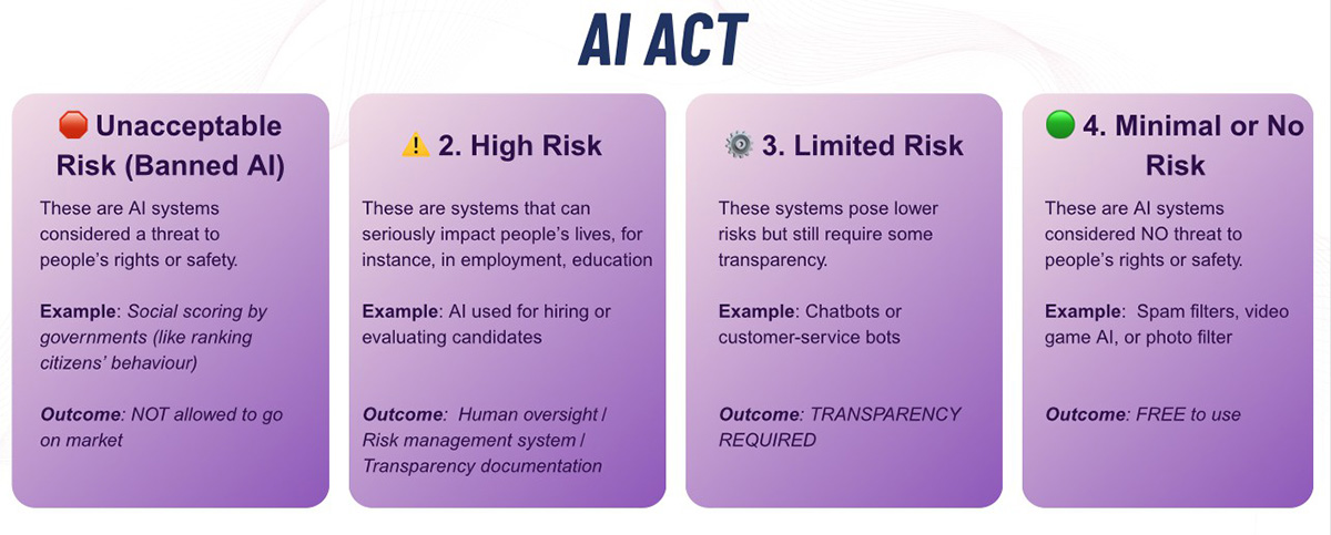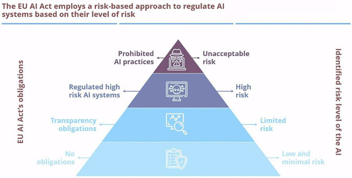 Primul pas este de a afla unde se situează un sistem în piramida de risc a EU AI Act, ca mai apoi să înțelegem ce măsuri de protecție sunt necesare.