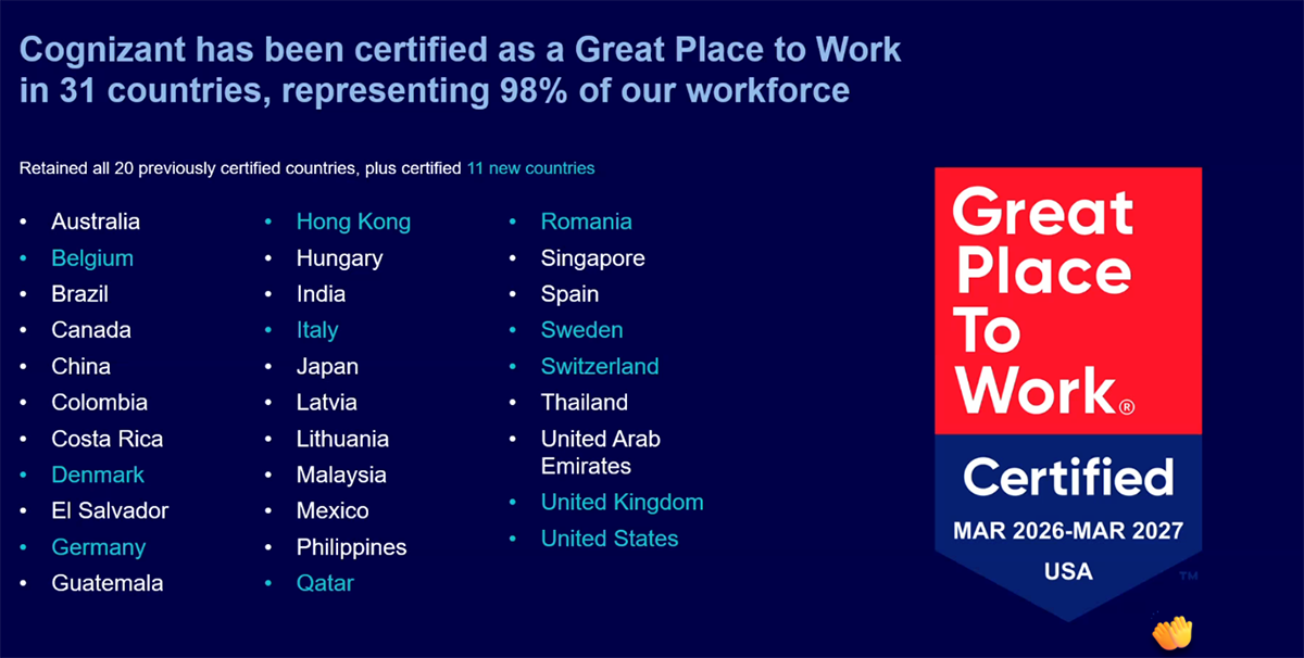 La nivel global, Cognizant este certificată Great Place to Work 2026-2027 în 31 de țări, acoperind 98% din forța sa de muncă.