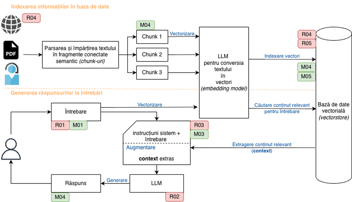 M04: Validarea tuturor informațiilor care sunt ingerate în baza de date (implementarea unor filtre cu scopul identificării textelor riscante, izolarea fragmentelor care au un scor ridicat out-of-distribution, modelarea topicului pentru identificarea fragmentelor cu ton urgent/imperativ/ instructiv), implementarea unor filtre la generarea răspunsului sau calcularea unor metrici și folosirea lor ca filtru (nivelul de ancorare al răspunsului în informațiile extrase sau groundedness)