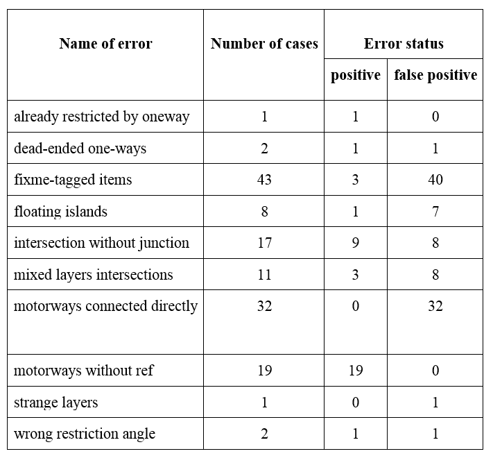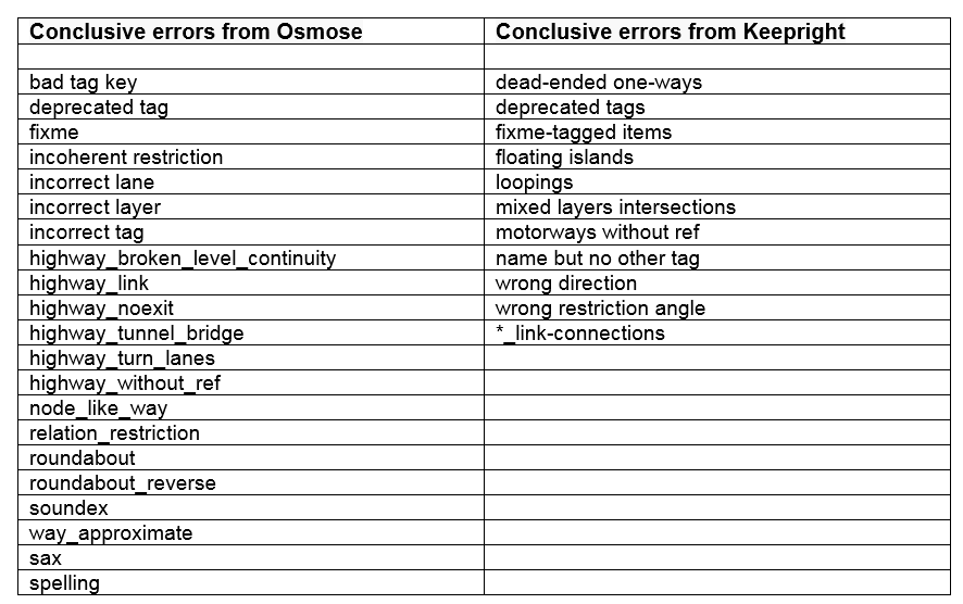 Această aplicaţie identifică următoarele categorii de erori, care afectează rezultatele sistemului de navigaţie: dead-ended one-ways, missing tags, motorways without ref, floating islands, fixme-tagged items, relations without type, loopings, mixed layers intersections, strange layers, motorways connected directly, missing type, missing from way, missing to way, from or to not a way, via is not on the way ends, restrictions, wrong direction, _link-connections, deprecated tags.*