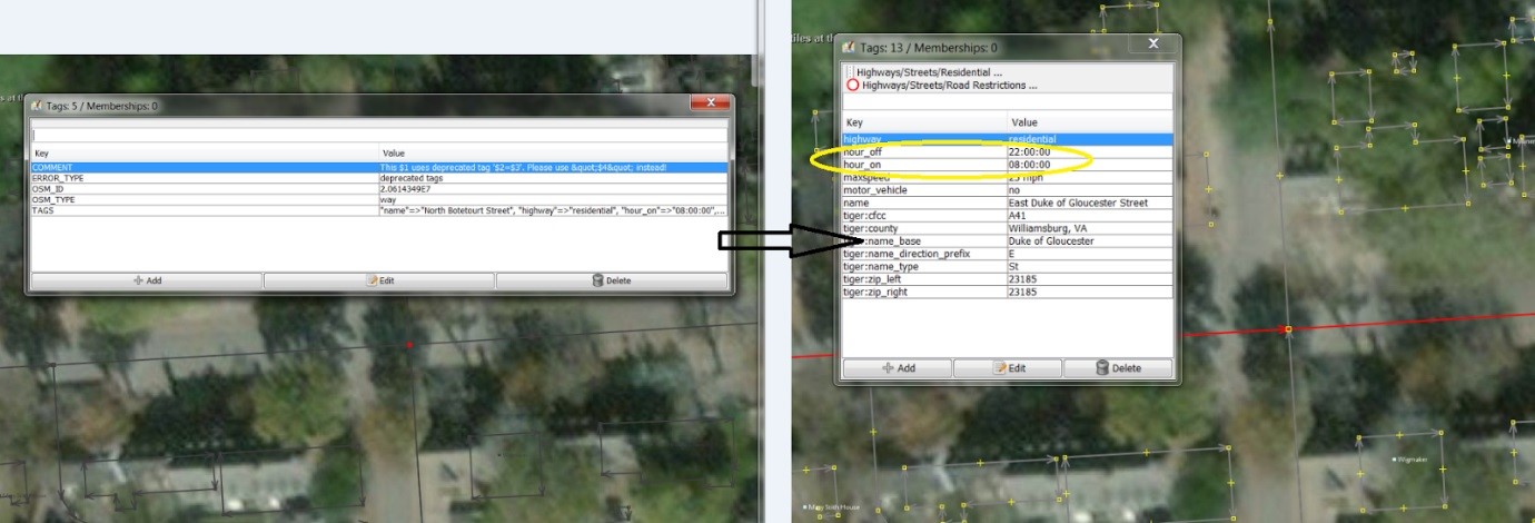 Fişierul final este încărcat în programul JOSM pentru analizarea şi editarea posibilelor erori. Un exemplu de eroare des întâlnit este "deprecated tag", filtratat atât din Keepright cât și din Osmose. "Deprecated tag" se refera la tagurile care nu mai sunt folosite și care trebuie înlocuite sau eliminate din OSM. În următoarea imagine (Fig.7) putem vedea cum arată eroarea și cum putem să o corectam. În acest caz, erorile sunt "hour-on" și "hour-off" care au fost șterse conform OSM Wikipedia.