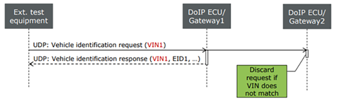 Inițierea conexiunii se face prin cererea de identificare a vehiculului, Vehicle identification request, prin care se compară VIN-ul (Vehicle Identification Number) din cerere cu cel returnat de către vehicul. Deoarece vorbim despre cazul în care mai multe mașini sunt conectate la aceeași rețea și au același IP, vrem să primim confirmare doar de la o mașină specifică. Celelalte mașini din aceeași rețea vor primi și ele această cerere, însă dacă VIN-ul nu coincide, vor renunța la transmisie.