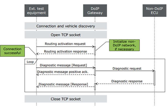 Odată ce conexiunea este deschisă, DoIP este liber să ruteze mesajele de diagnoză către ECU-ul care urmează a fi testat sau reprogramat.