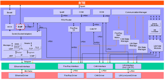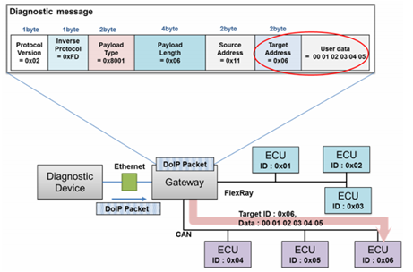 Într-un sistem AUTOSAR, mesajul de diagnoză transmis de către un tester extern este împachetat sub formă de pachet TCP Datagram și trimis către gateway. Din acest pachet de tip datagram sunt extrase mai apoi informațiile legate de mesajul de diagnoză (DoIp data type, data length, target address, data payload) și sunt transmise mai departe la modulul DoIP.