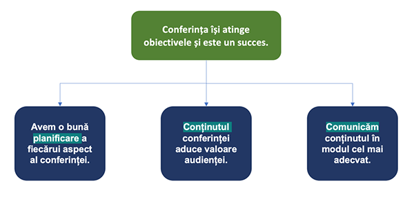 Pentru a ne defini ce înseamnă succesul pentru conferință am folosit un concept din gândirea strategică: diagrama Minto. Avantajul ei este că ne permite ca, pornind de la obiectivul pe care vrem să îl atingem - aflat în diagramă sau piramidă pe primul nivel, să putem detalia pașii necesari pentru a atinge obiectivul pe nivelul 2. Apoi, pe nivelul 3, stabilim cum vom realiza concret acei pași ș.a.m.d. În acest fel, ne structurăm gândirea și ideile și ne asigurăm că nu am pierdut ceva esențial, necesar pentru succesul conferinței.