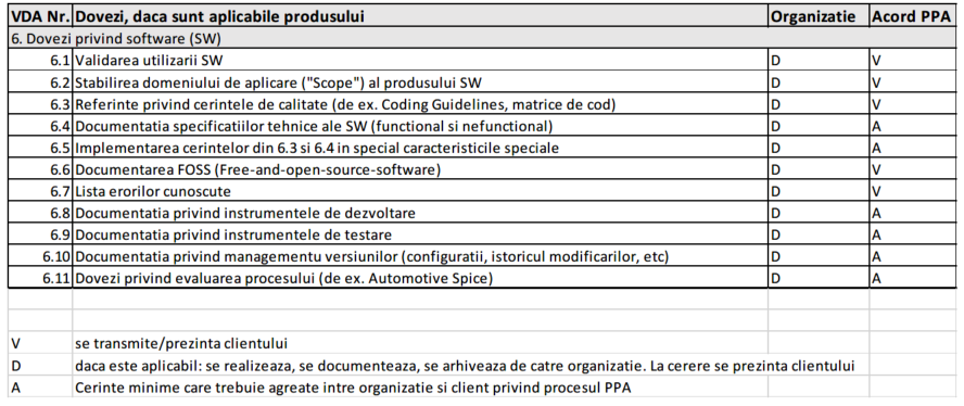 Vedem în extrasul de mai jos din volumul VDA 2, care sunt subcategoriile necesare pentru partea de software. Acestea vor fi agreate și detaliate de către client și furnizor după semnarea contractului dintre părți. VDA încurajează toți furnizorii să nu neglijeze acest acord inițial și să documenteze într-un format propus tot de VDA (anexa 2) toate detaliile organizatorice și planificarea procesului PPAP.