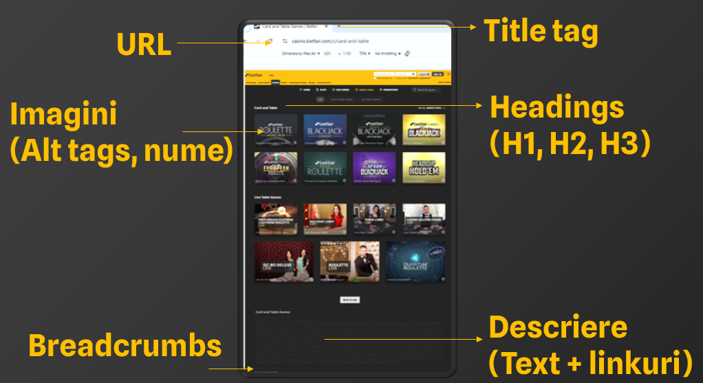 În exemplul Betfair Casino, noile categorii au fost create grupând seriile de jocuri relevante pentru fiecare cuvânt-cheie. Elementele paginilor au fost optimizate pentru cuvintele-cheie după cum urmează: