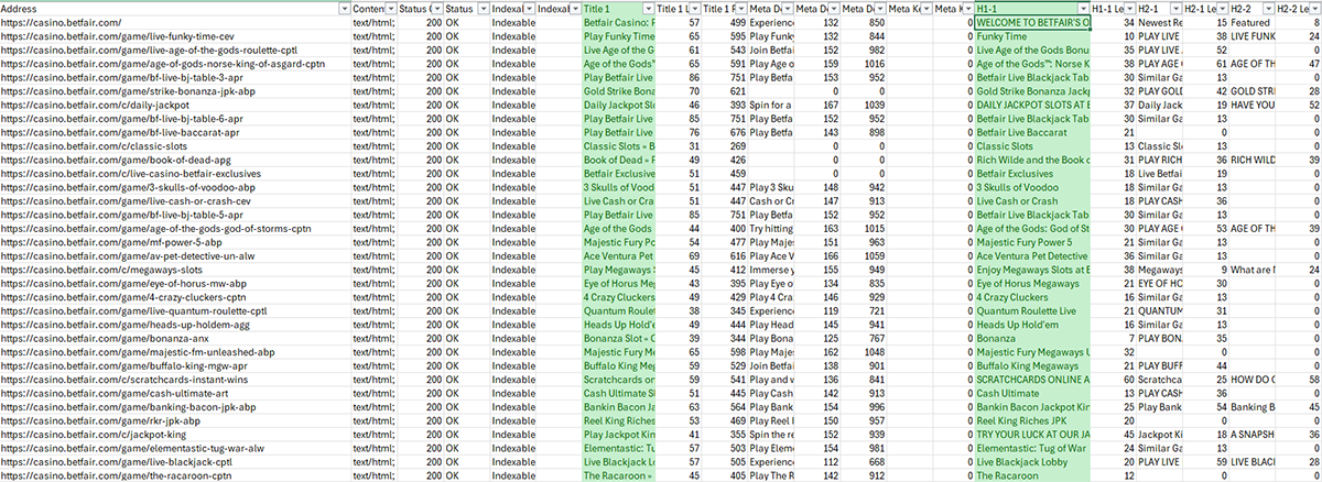 Extras dintr-un crawl al site-ului Betfair Casino efectuat cu ajutorul crawl-erului Screaming Frog