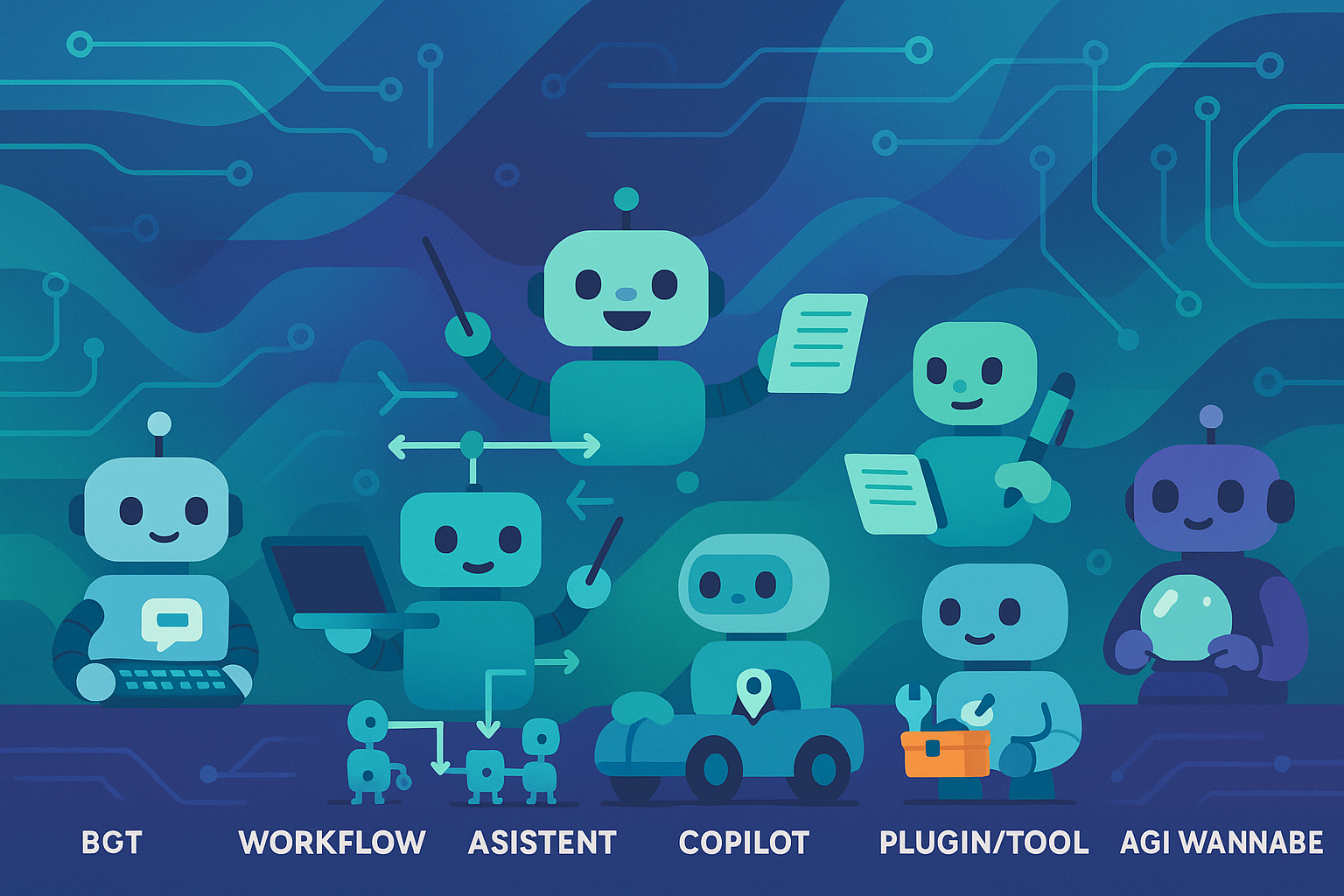Script pentru un bot de generat imagini (despre Scripts, în curând): "O scenă ilustrată stil flat design / vector art cu mai mulți roboței prietenoși, fiecare reprezentând o categorie digitală: Bot: un roboțel mic, simplu, cu o tastatură în față, care doar răspunde la întrebări (ca un asistent de helpdesk). Agent: un roboțel mai complex, cu mai multe brațe, care ține un laptop și câteva documente, sugerând că ia decizii și organizează informații. Workflow: un roboțel-dirijor cu baghetă, care coordonează mai mulți roboței mici conectați prin săgeți sau linii, sugerând fluxuri de date. Alte creaturi digitale: Asistent: un roboțel cu un carnețel și un creion, care pare să țină minte lucruri. Copilot: un roboțel așezat pe scaunul din dreapta într-o mașinuță, care ține o hartă. Plugin/Tool: un roboțel cu o trusă de scule mică (șurubelniță, cheie franceză). AGI wannabe: un roboțel cu un glob de cristal, privind spre viitor. Fundalul: abstract, tehnologic, cu linii de circuit și culori moderne (albastru, mov, verde). Atmosferă prietenoasă și jucăușă, nu înfricoșătoare."