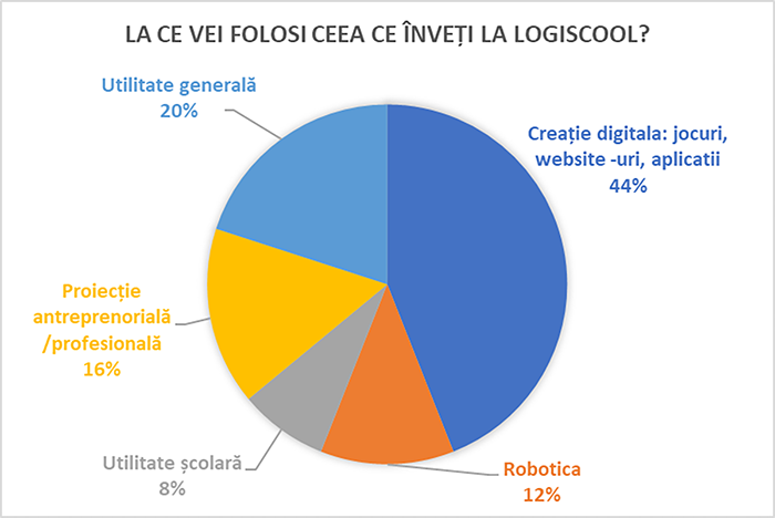 Am continuat cu întrebarea "La ce vei folosi ceea ce înveți la Logiscool ?" pentru a analiza utilitatea percepută de elevi referitor la temele învățate în școala de programare: tehnologii creative, noțiuni introductive în AI, robotică și programare. Răspunsurile primite indică o orientare predominant aplicativă a competențelor digitale în curs de dobândire de către elevii de primară și gimnaziu.