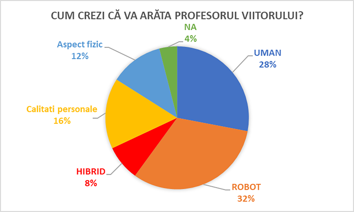 Peste o treime din respondenți, mai exact 32% anticipează un profesor sub forma unui "robot" reflectând oarecum internalizarea discursului contemporan referitor la digitalizare și automatizare. În același timp, 28% din respondenți rămân la ideea că profesorul viitorului va rămâne un om, real și prezent în clasa căreia îi predă, indicând nevoia de interacțiune și relaționare umană. Un segment mic, de 8%, prezic existența unei formule hibride dintre om și tehnologie. Interesant este și faptul că 28% dintre elevi și-au axat răspunsurile pe dimensiunea "trăsături" - fie de aspect fizic (12%) fie de natură intelectuală și morală (16%) precum inteligență, respect, înțelegere.