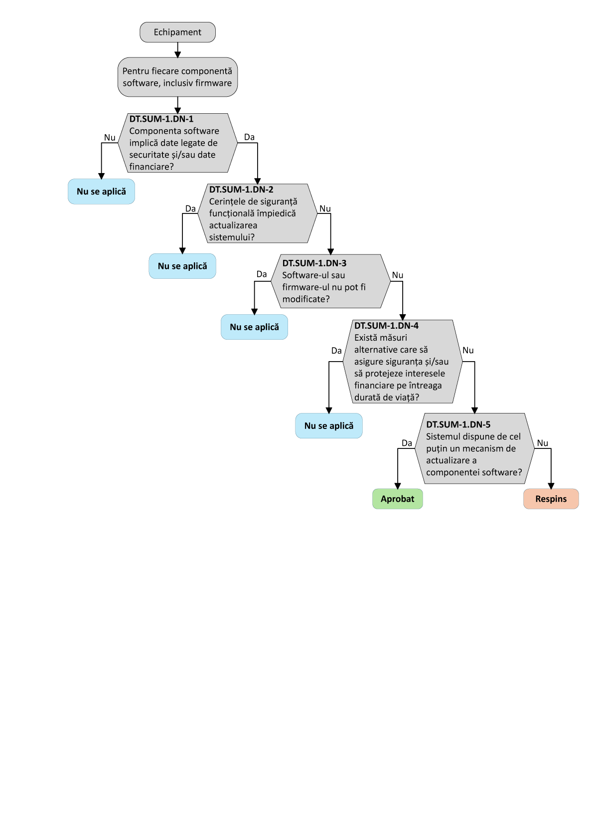 Această etapă aplică cerințele specifice produsului prevăzute în standardul EN ISO/IEC 18031-3, acordând o atenție deosebită activelor financiare și riscurilor legate de fraudă. Arborii decizionali sunt evaluați pentru fiecare componentă software și mecanism de actualizare, pentru a stabili dacă sunt necesare capacități de actualizare sau măsuri de protecție alternative. Evaluarea asigură că software-ul care afectează valori financiare rămâne protejat pe toată durata ciclului de viață al produsului. Această precizare aliniază cerințele generice de securitate cibernetică la contextul real de afaceri și de utilizare al produsului.