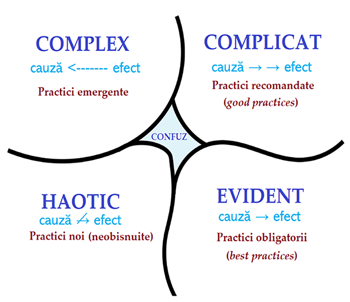 Dave Snowden abordează problema dintr-o altă perspectivă, poate și mai subtilă: relația dintre cauză și efect (Figura 1.b).