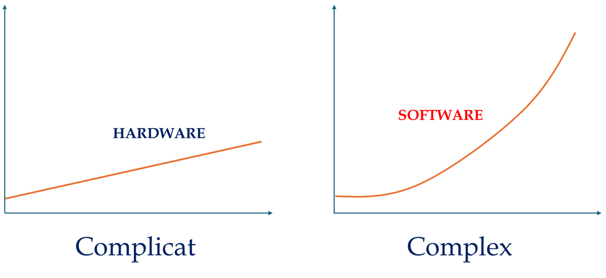 Hardware-ul, în ciuda evoluției sale spectaculoase (cu o creștere exponențială a anumitor performanțe, conform legii lui Moore), rămâne în esență un sistem complicat. În schimb, software-ul este profund complex. El evoluează într-un context dominat de incertitudine, schimbări de cerințe, tehnologii noi și interdependențe numeroase între componente și echipe.
